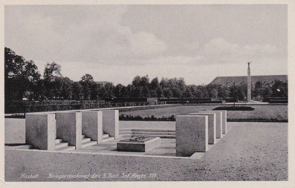 Näher betrachtet gehört das 30er-Denkmal, das in einer ersten Version (eine Aufnahme hat sich erhalten) am 13. Juli 1924 eingeweiht wurde, zu Rastatter Denkmalen, die aus den verschiedensten Gründen auf die Reise geschickt wurden. Das erste Denkmal für die Gefallenen im Ersten Weltkrieg von 1914 bis 1918 des in Rastatt 1873 gegründeten und stationierten 2. Badischen Feld-Artillerie-Regiments Nr.30 stand etwa an der Stelle, gegenüber der heutigen Schloss-Galerie, wo die barocke Gartenfigur der Flora mit ihrem Füllhorn steht.