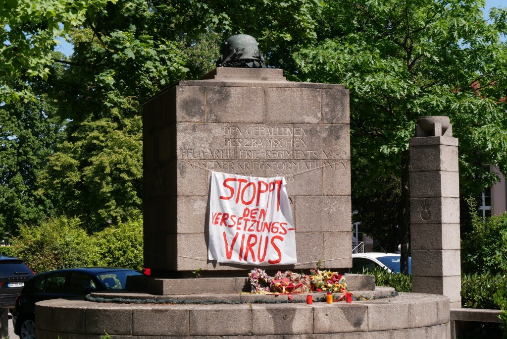 Dort findet sich inzwischen das Gefallenendenkmal des Hohenzollern-Regiments Nr.40, das mitten im Schlosspark war. Auch das am 10. Oktober 1937 vor der Gartenfront der ehemaligen Barockresidenz des Infanterie-Regiments 111 eingeweihte Denkmal wurde versetzt und findet sich ziemlich versteckt in der Ecke Lyzeumstraße/An der Ludwigsfeste im Schlosspark. Sicher wird man in Nach-Corona-Zeiten wieder auch das ruhende 30er-Denkmal-Verlegungs-Projekt aufgreifen.