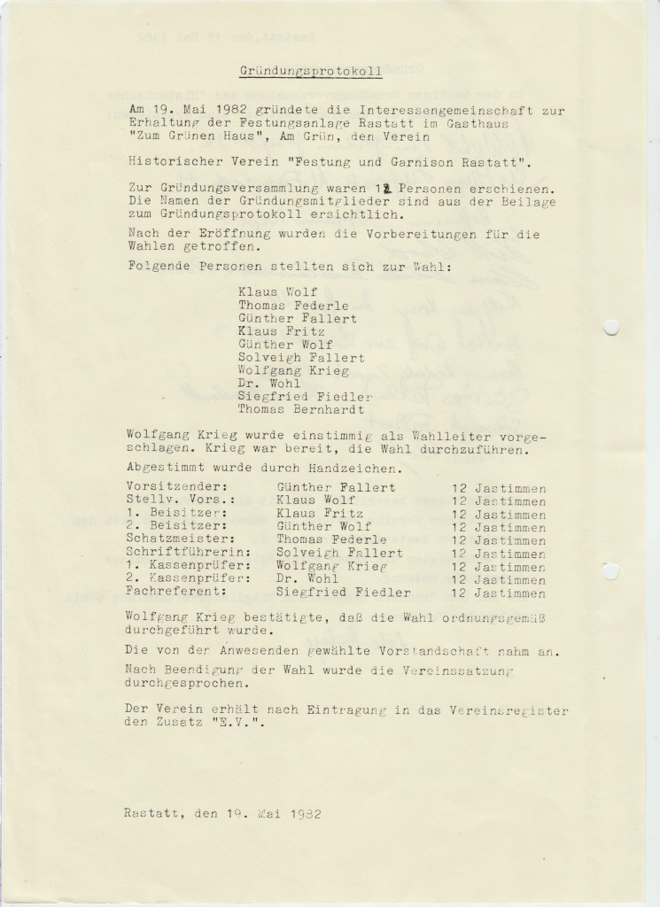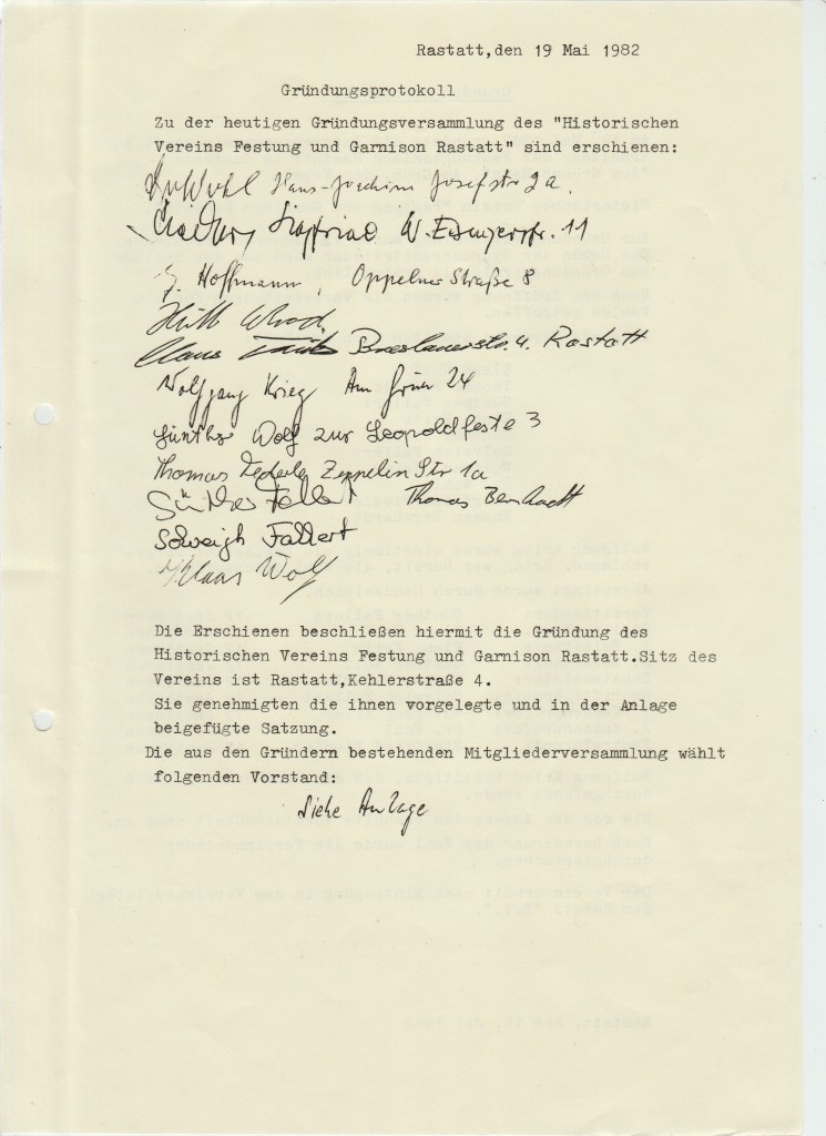 als unser Verein am 19.Mai 1982 gegründet wurde, wurde das in einem Gründungsprotokoll dokumentiert. 12 Rastatter waren es,die sich im „Grünen Haus “ zusammenfanden und den Verein aus der Taufe hoben.Allerdings waren die Anfangsjahre schwer und von Rückschlägen begleitet. Erst 1985 mit den frischgewählten Vorstandsteam Dr.Wohl und Karl-Josef Fritz ging es aufwärts und die Mitgliederzahlen gingen nach oben.Leider wurde dem Verein 1989 aus baupolizeilichen Gründen untersagt, weiterhin das Cavalier I betreten. Es gehörte damals der Fa. Holz- Hertel und weitere Restaurierungsarbeiten in diesem Festungsteil waren damit unmöglich. 1990 wurde Michael Feik zum 1. Vorstand gewählt und Charly Fritz sein Vertreter. 1991 entschloss man sich,den Vereinsname zu ändern. Der Zusatz „Festung und Garnison „wurden ersatzlos gestrichen.In eigener Sache : Die Häufung des Namens “ Wolf“ in diesem Dokument ist rein zufällig, d.h. die jetzigen Namensträger sind mit diesen weder verwandt noch verschwägert. Anfragen von Mitgliedern sind damit beantwortet.