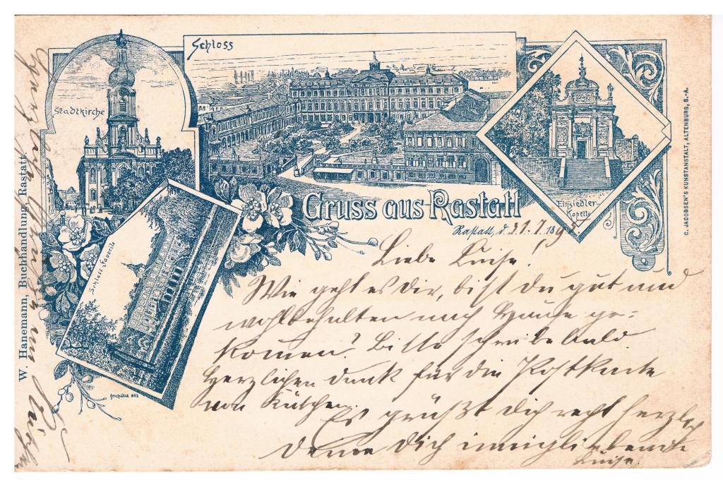 Was auch mehrfach unter den Einsendungen zu Rastatts ältester Ansichtspostkarte dabei war, einfarbige Lithographien. So warb Wirt Reinbold vom „Gasthof zum Schwert“ 1895 mit Motiven des Schlosses, des Bernhardusbrunnens, der Stadtkirche St. Alexander und der Einsiedelner Kapelle. Ebenso dabei Zigarrenfabrikant Mayer mit denselben Motiven auf einer Ansichtspostkarte, die Reinhold Weisenburger aus Steinmauern eingereicht hatte.