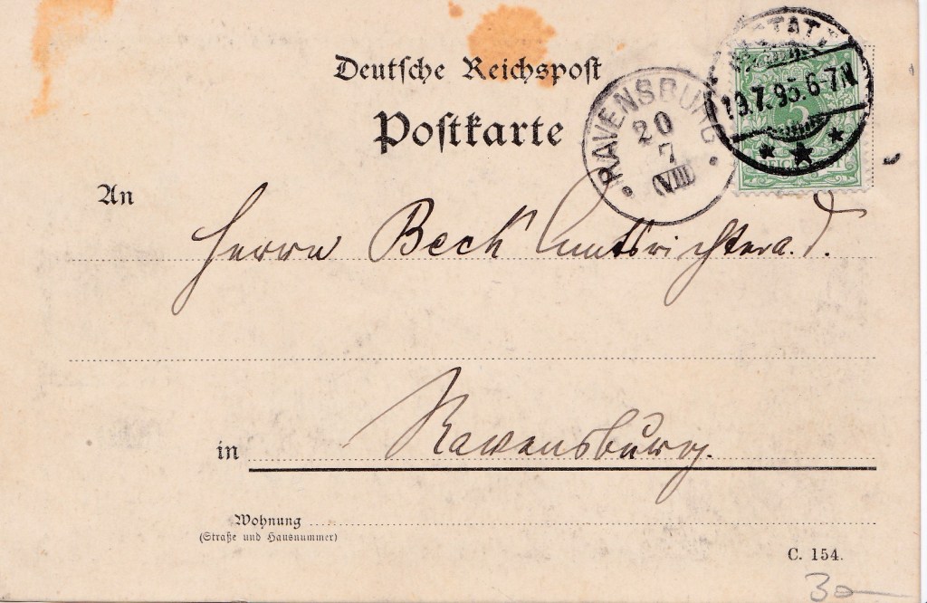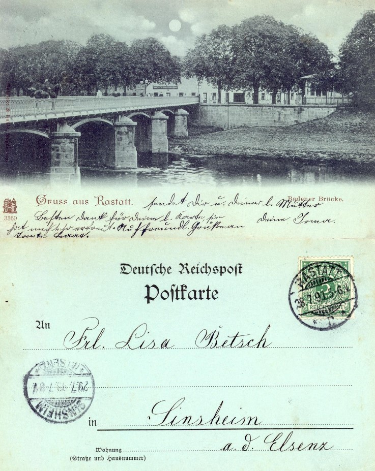 Inzwischen ist der Brauch des Kartenversendens an Verwandte, Freunde und Bekannte an Gymnasien einer freudigen E-Mail gewichen. Rastatter Abiturpostkarten sind bis 1957 belegbar, aber beim Betrachten durchgehend voller Symbolik und vielfach ein Spiegel der Zeit. Die nun greifbare älteste Rastatter Abiturkarte wurde von Clemens Günther aus Krautheim, einem der von 25 Abiturienten 1895, von Rastatt nach Ravensburg versandt. Bereits einen Tag später war sie bei 5 Pfennig Briefmarkenporto am Ziel.