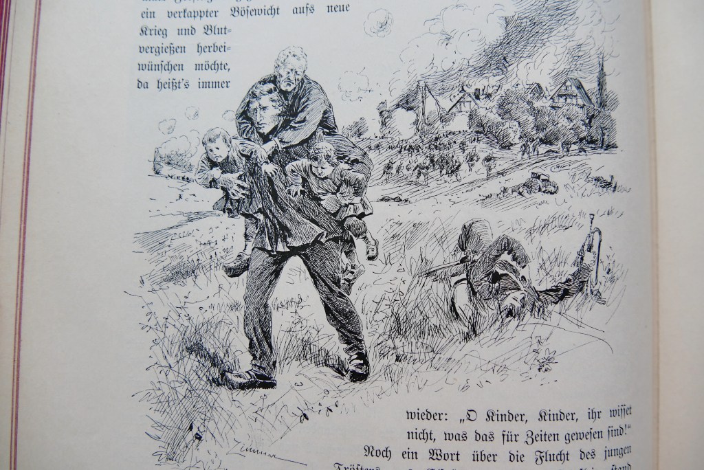 Da der Schlachtenmaler Ernst Zimmer (1864-1924) für zahlreiche Illustrationen sorgte, die vom Autor noch abgesegnet wurden, werden die ganzen Schilderungen noch authentischer.In 60 Kapiteln wird der Leser noch heute nach und nach in die tagebuchähnlichen Aufzeichnungen mit hineingezogen. Die ländlichen Idylle wird vom Schlachtenlärm und dem geschilderten Schicksal der Opfer drastisch gestört. Da ist von plündernden deutschen Soldaten aber auch von nordafrikanischen, französischen Opfern die Rede.