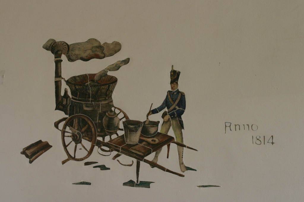 In seinem Innern wurden einige künstlerische Kachel-Arbeiten postiert. Sie zeigten, beginnend mit dem Rammbock „Widder“, die Entwicklung der Artillerie über die Jahrhunderte. Als die Franzosen nach 1945 die Kasernenanlage als „Quartier Joffre“ führten, hielten sie auch die deutschen Fayencen in Ehren. Im Jahr 1990 konnte ein Mitglied des Historischen Vereins durch den Kontakt mit Peter Schmitt von der Karlsruher Majolika einwandfrei datieren, dass die Arbeiten vom Vorzeigekünstler Gustav Heinkel entworfen worden waren. Selbst einige Urmotivvorlagen fanden sich an.