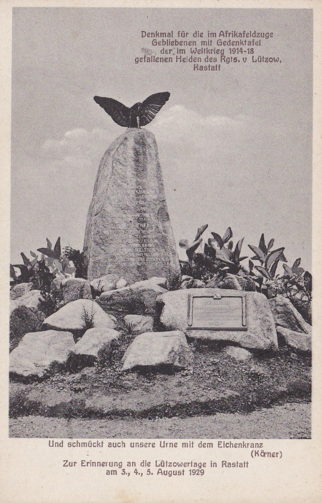 Zuerst noch postiert auf der gegenüberliegenden Seite, folgte 1929 die Versetzung. Der Traditionsverband der „Ehemaligen Lützower“ hatte die Verlegung des Denkmals beim Rastatter Oberbürgermeister August Renner beantragt, weil es „nicht in würdiger Weise“ behandelt worden war. Kinder hatten das Stein-Ensemble als Spiel- und Tummelplatz genutzt. Mit einer groß angelegten Feier wurde anlässlich des Regimentstreffens im August 1929 die Einweihung des „Denkmals für die im Afrikafeldzuge Gebliebenen Helden“ (so der Text der offiziellen Postkarte) begangen. Ergänzt wurde damals das „Heldenmal“ an neuem Platz durch eine Bronzetafel für die gefallenen Lützower im Ersten Weltkrieg. Tropische Pflanzen im Ensemble um den Monolit sollten in der an die Kolonialzeit des deutschen Kaiserreichs bis 1919 erinnern.