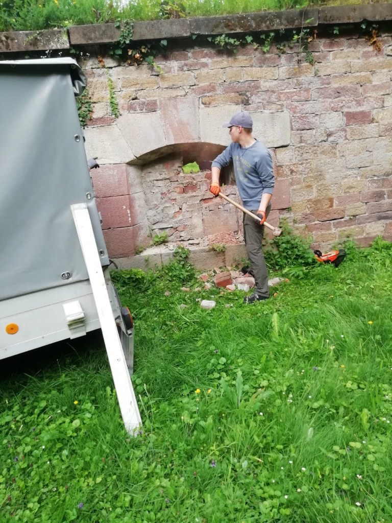 Dieses Wochenende war wieder unser „Bautrupp“ des Historischen Vereins an der Wiederherstellung der Flankenbatterie am Südring tätig. Aufgabe die Schießscharte, die zuggemauert wurde, wieder öffnen und anbringen eines Gitters. Mission erfüllt.Durch das Öffnen der Schießscharten bekommt das Bauwerk wieder seinen Charakter zurück und die geschichtsbegeisterten Besucher wird es erfreuen, eine gepflegt Anlage anschauen zu können. Einen rießen Dank ans „Bauteam“