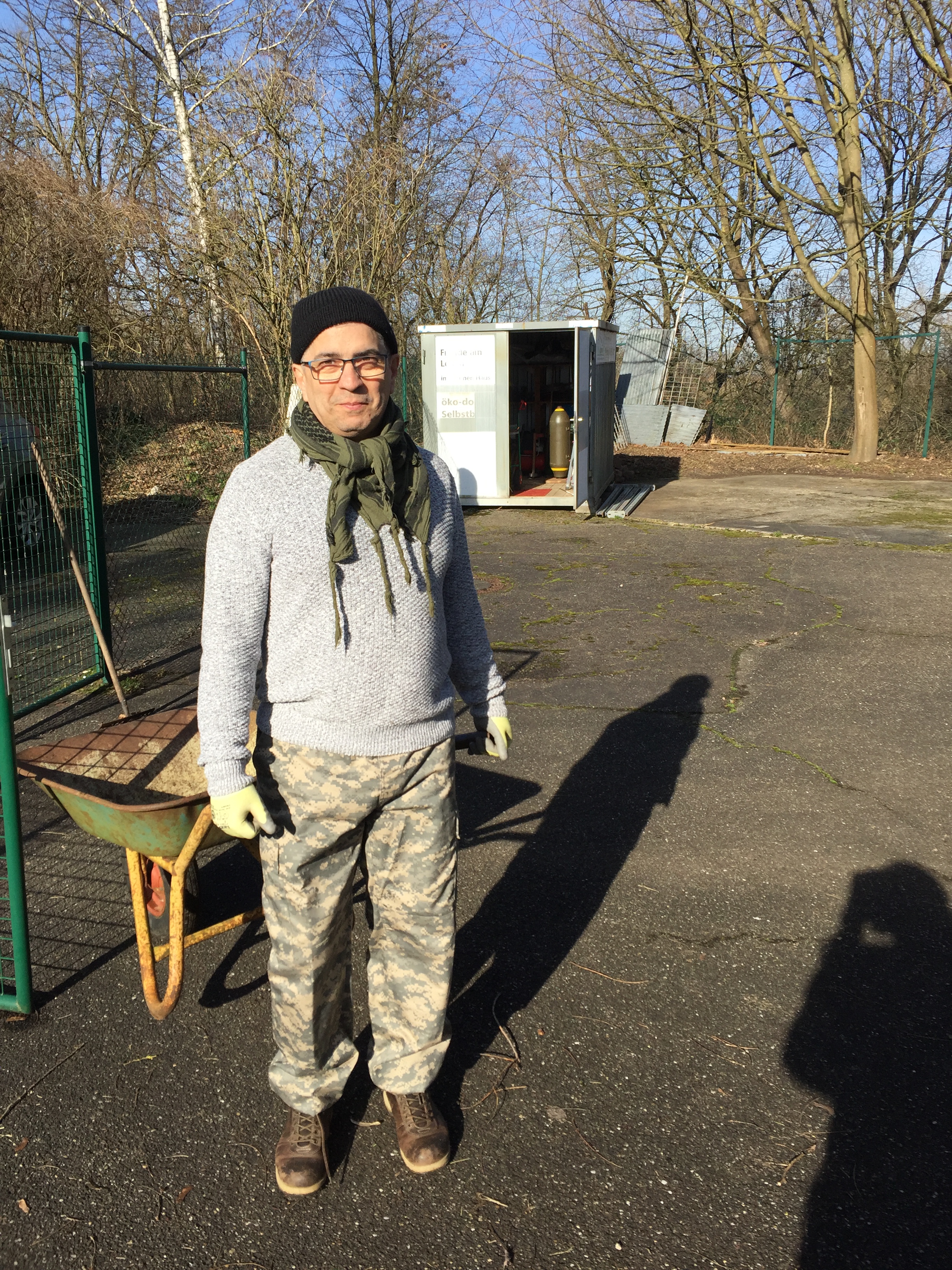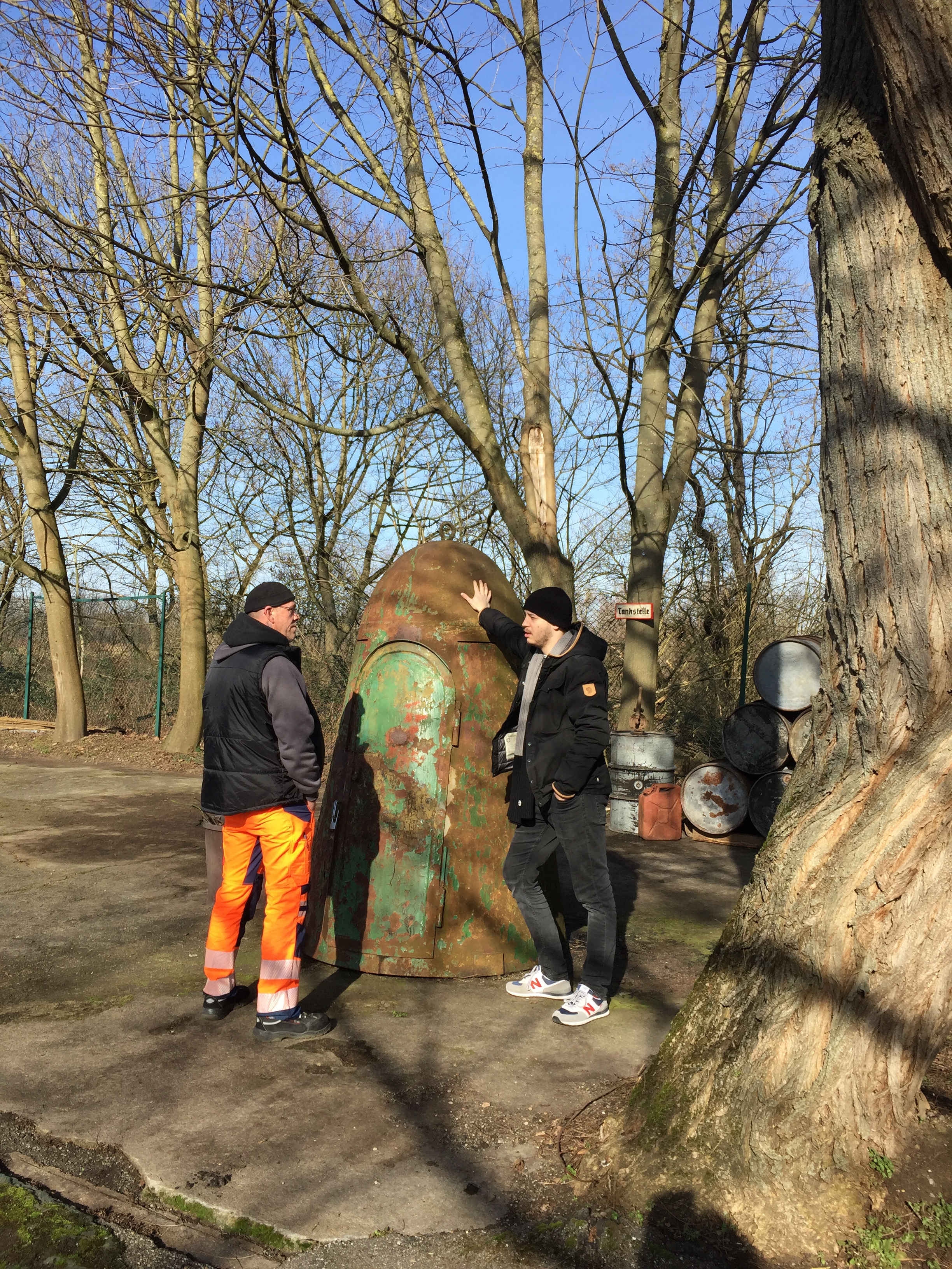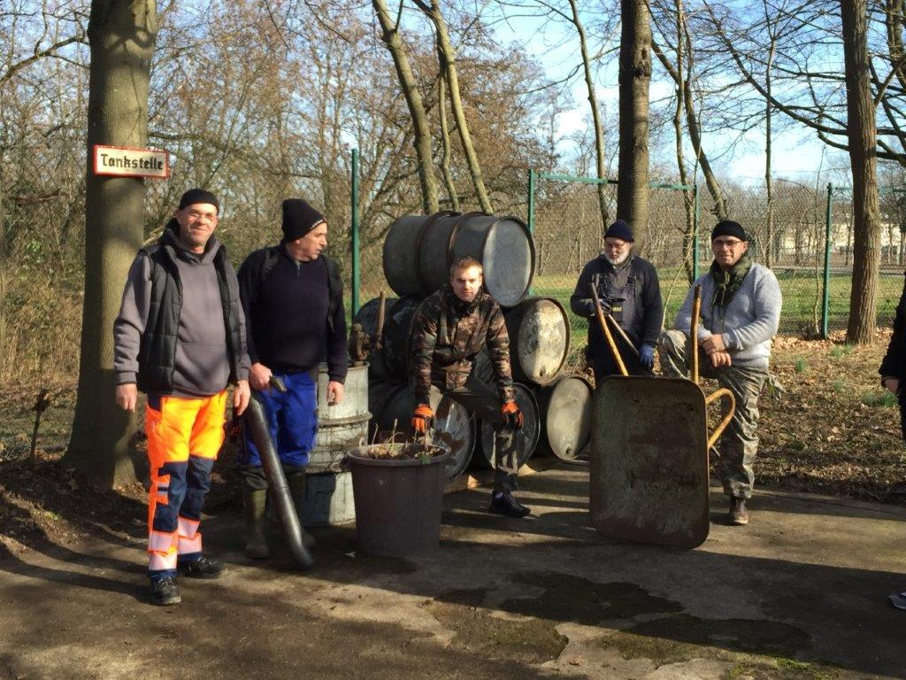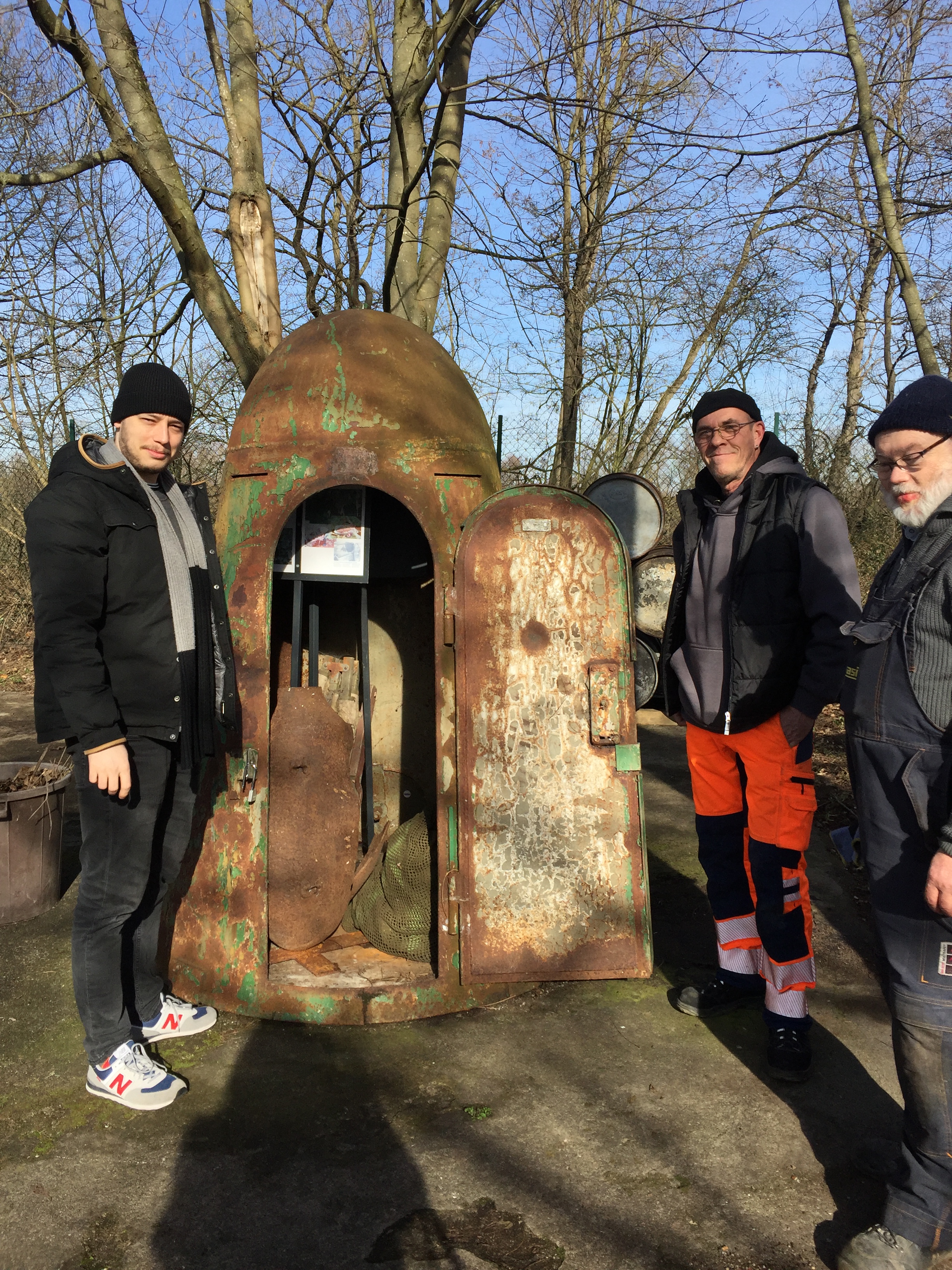 „Arbeit kann auch Spaß machen“, erklärt Boris Traub und Klaus Schnurr und Zoltan Sete stimmen ihm zu, während sie mit Laubsauger und Schubkarre hantieren. Stolz präsentieren sie die Neuerwerbung: eine Feldtankstelle. Ein paar Fässer, die in Kriegszeiten mit Benzin gefüllt waren und mit einer Pumpe zum Betanken von Panzern, Lastwagen und sonstigen Fahrzeugen gedacht war – Militärfahrzeuge, versteht sich. Man kennt immer jemand, der alte Sachen zu Hause hat, die im Wege sind und entsorgt, d.h. vernichtet würden- wie der Drehkranz für eine Zwei-Zentimeter-Flak 38 (aus der Luftverteidigungszone West bei Karlsbad), der jetzt im Bunkermuseum steht. Besonders rührig ist Karl Schweizer, der schon allerlei Inventarstücke herbeigeschafft hat. Er hat auch die Steine zur Bedeckung des Unterstands besorgt. Nun also auch eine Feldtankstelle. Davor liegt eine Bunkertür, die man auch irgendwo aufgetrieben hat und die einbetoniert werden muß. Alles Originale, alles echt! „Denkmäler sind große Stolpersteine“, sagt Philipp Erben, der als Besucher mitgekommen ist, „man muß sie erklären und ihre Funktion verstehen.“ Dann ist es Geschichtsunterricht ersten Ranges und kommt erfahrungsgemäß auch bei Kindern gut an.
