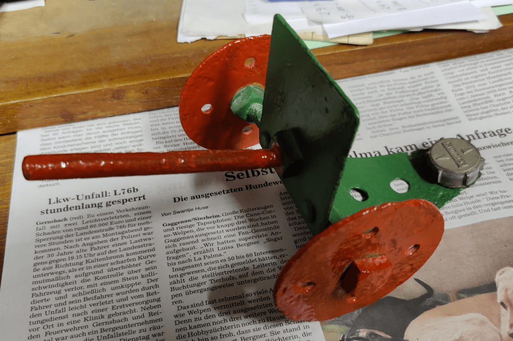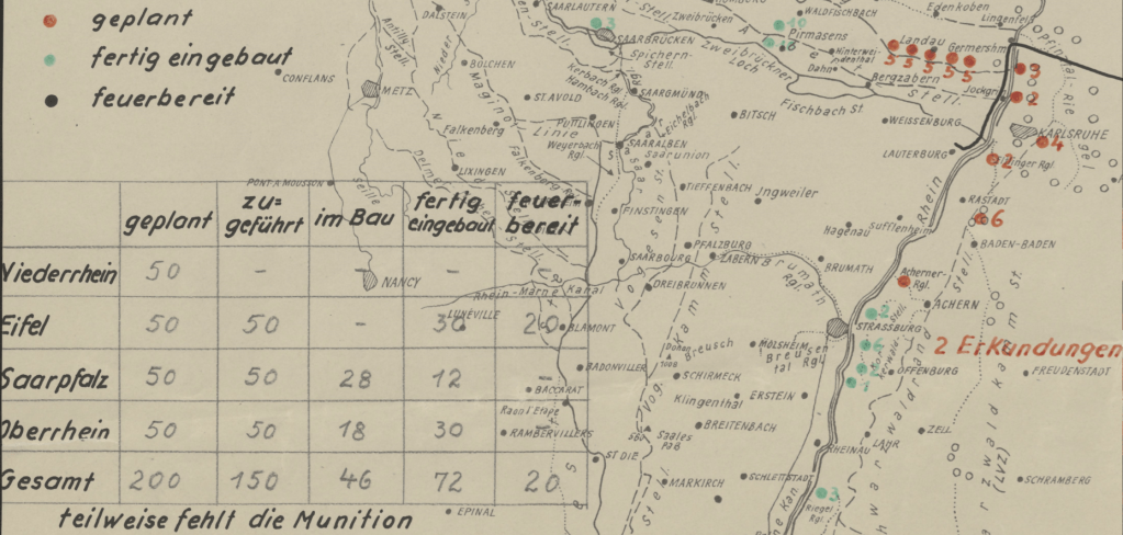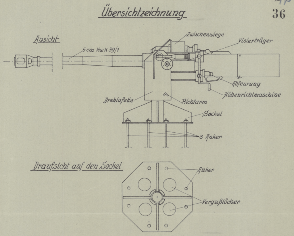 Doch warum handelt es sich bei dem zunächst unscheinbar anmutenden Betonsockel? Wo heute Einfamilienhäuser stehen, wurden im Februar 1945 die Vorbereitungen für den finalen Akt des Zweiten Weltkrieges in der Region getroffen. Für den Bereich der Festungspionierkommandantur 1 am Oberrhein war die Lieferung von insgesamt 319 Geschützen vorgesehen, darunter 50 Stück sog. 5 cm Kampfwagenkanonen 39/1, die ursprünglich zum Einbau in Panzerkampfwägen, wie den Panzerkampfwagen III vorgesehen waren. Die restlichen für den Oberrhein bereitgestellten Geschütze setzten sich aus regulären PaK (Panzerabwehrkanonen), aber auch aus ganzen Panzertürmen zusammen, wie u.a. der Fund eines Panther-Drehturms bei Iffezheim in den 1970ern beweist. Das Vorhaben war Teil eines Armierungsprogramms, das die mittlerweile obsolet gewordene Panzerabwehr des Westwalls unterstützen sollte, der erneut zur Frontlinie zu werden drohte. Eine Archivale im Bundesarchiv, Abteilung Militärarchiv in Freiburg im Breisgau zeigt, dass bis zum 13.02.1945 immerhin 45 der 50 beorderten 5cm KWK am Oberrhein eintrafen und dort in ortsfeste Stellungen eingebaut wurden. 6 dieser Geschütze waren für den Bereich zwischen Kuppenheim und Oberndorf vorgesehen. Da sie ortsfest und nicht in die vorgesehenen Panzerkampfwägen eingebaut wurden, entwickelte das Militär die sog. Sockellafette Ia (Sk-L Ia), welche die Rohre aufnehmen konnte. Diese wiederum wurde mit Gewindebolzen an einem Fundament befestigt, das die Kanone bei Gebrauch an Ort und Stelle halten sollte. Aufgrund der speziellen Anordnung der Löcher, der konkreten Abmessungen, sowie der Erkenntnisse aus dem Bundesarchiv lässt sich mit Gewissheit sagen, dass auch das neu erworbene Fundament aus Oberndorf eine solche Sk-L Ia aufnahm.