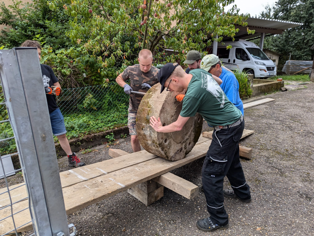 80 Jahre lang hatte die neueste Erwerbung des Historischen Vereins Gelegenheit Moos anzusetzen. Damit war es am Samstag, den 03. August 2024 vorbei: Die Aktiven unseres Vereins leiteten in einer beispielhaften Aktion unter Einsatz aller verfügbaren Kräfte den Umzug des Relikts ein, um es in Zukunft einer angemessenen Präsentation zuführen zu können. Nachdem das Objekt seit der Endphase des Zweiten Weltkriegs in einem Oberndorfer Garten ruhte, war es in den 70er Jahren von seinem Ursprungsort wegbewegt worden, der zu dieser Zeit zum Wohngebiet umgewandelt wurde. Daher bestand kein historischer räumlicher Zusammenhang mehr, eine Translozierung zum Gelände des Historischen Vereins an die L75a schien daher auch aus denkmalpflegerischer Sicht unproblematisch. Das Objekt besitzt bemerkenswerten dokumentarischen Wert für die örtliche Heimatgeschichte und stellt für das vereinseigene Freilichtmuseum eine weitere Bereicherung dar.