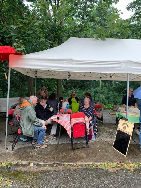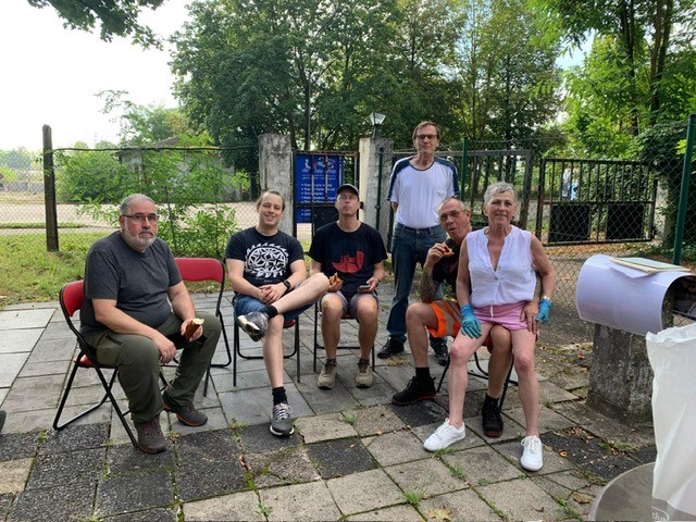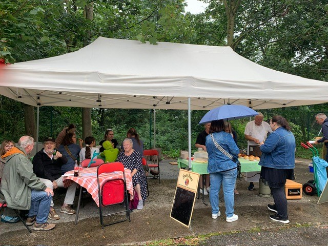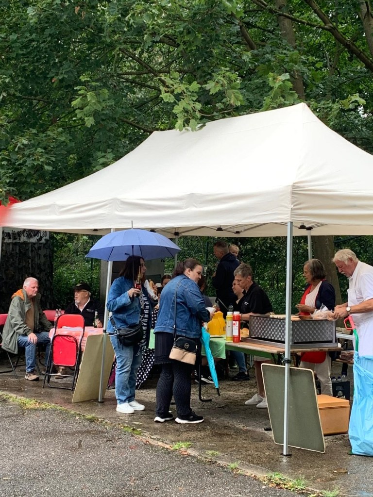 Am Grill waren Charly und Heiderose Fritz, assistiert von Christel Sittinger. Die Rezeption mit Büchertisch und Spendenbox bewachten Uli Kirchberger-Willems und Michael Lochbühler-Stamm, die, notdürftig beschirmt, auch ab und zu ein bißchen Regen abbekamen. Kuchen hatten Heiderose Fritz, Monika Steinmacher, Irmgard Stamm und Christine Umhey gebacken , der war im Nu ausverkauft – ebenso wie die leckeren Würstchen! Und für die Logistik sorgte Manfred Möhrmann, der, als es einmal stärker regnete, kurzerhand den Container zum trockenen Unterstand umfunktionierte. Um 15 Uhr war alles aufgegessen bis auf ein paar trockene Brötchen … was will man mehr? So funktionierte alles reibungslos und Alle waren zufrieden … nur für die vielen kleinen Kinder, die den Bunker vielleicht nicht so spannend finden, müssen wir uns künftig etwas einfallen lassen!