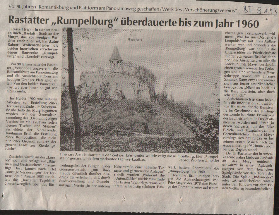Den befestigten, gewundenen Weg ging es hinauf auf die Plattform, die als Relikt geblieben ist. Der „Verschönerungsverein“ hatte sich 1922 nach mancherlei Maßnahmen (Löwenbrunnen am Karlsruher Tor, „Loreley“ am heutigen Oranger Platz u.a.) wieder aufgelöst, die Rumpelburg wurde in den 1960er Jahren wegen Vandalismus abgetragen und existiert vor allem im Gedächtnis ehemaliger Dörfler-Kinder. Auch ein Soldat an der Ostfront hat 1944 dem Wehmutsort ein Gedicht gewidmet (s.Anhang).