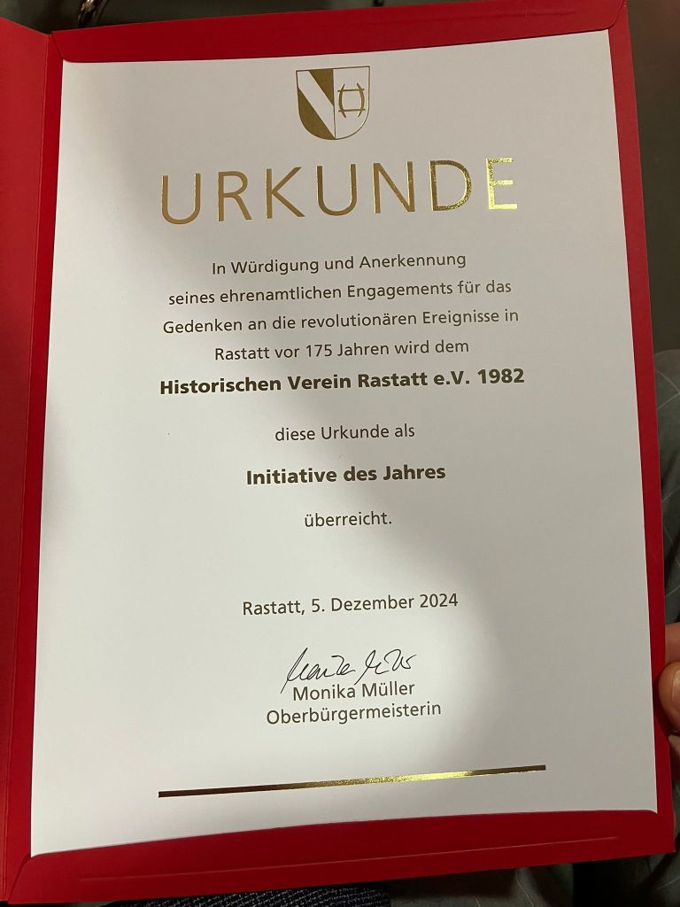 Auszeichnung “ Initiative des Jahres “ für die Bemühungen rund um „175 Jahre Badische Revolution“