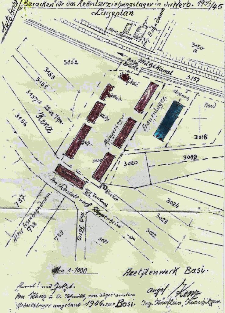 Der Niederbühler Hobbyhistoriker Wilhelm Kenz berichtet von 8 mit Stacheldraht umgebenen Holzbaracken und einer im Rohbau befindlichen Frauenbaracke . Die Holzbaracken wurden bei Kriegsende abgebrannt. Das Gelände wurde 1946 von der Firma Basi gekauft und zum Acetylenwerk umgebaut. Die Frauenbaracke wurde die erste Produktionsstätte. Das Werk nahm 1949 die Produktion auf.