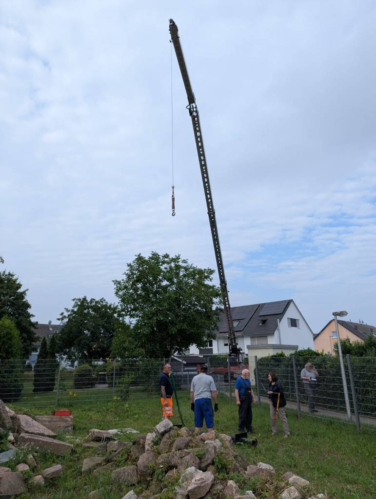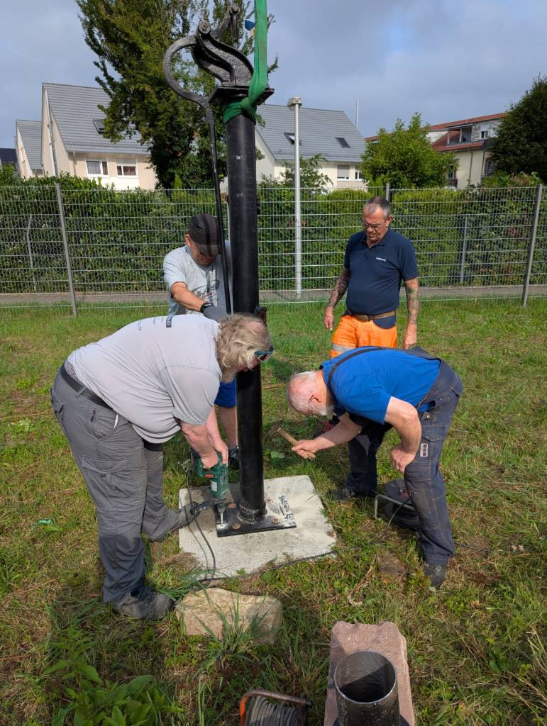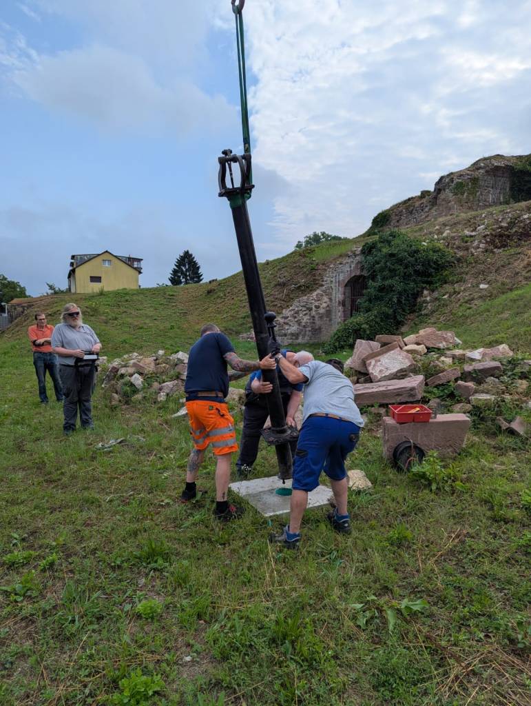 Vier Männer des Historischen Vereins (Karl Schweizer, Klaus Schnurr, Boris Traub und Jens Langguth) waren beteiligt und auch Kurt Ziermann legte Hand an, um das schwere Stück in die richtige Position zu bringen.
