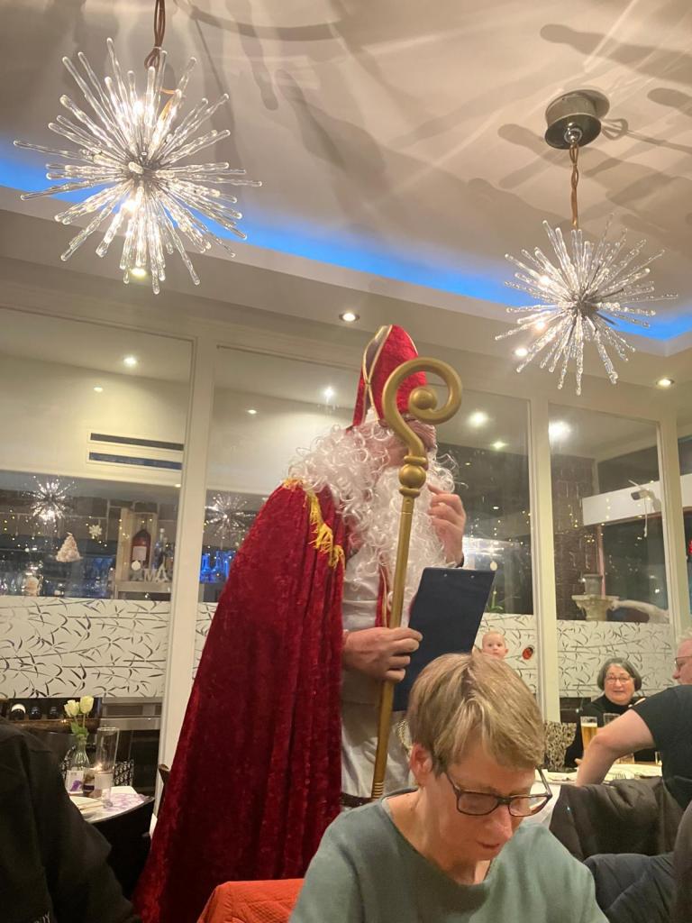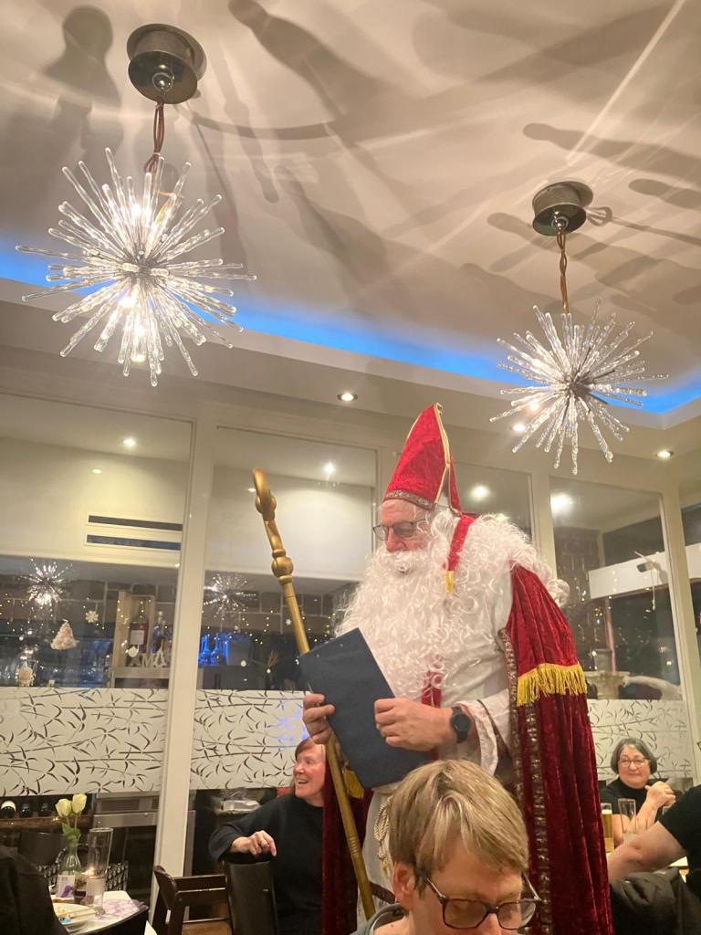 Für einen besonderen festlichen Akzent sorgte Hermann Blaschek: Im Nikolauskostüm trug er den eigens für diesen Anlass verfassten, humorvollen Text „Weihnachten unter Strom“ vor und brachte damit die Runde zum Schmunzeln. Trotz der stimmungsvollen Programmpunkte standen die Teilnehmenden vor einer organisatorischen Herausforderung. Obwohl im Vorfeld mehrfach auf die erwartete Gruppengröße hingewiesen und am Vortag 30 Personen angemeldet worden waren, wurde unsere Gruppe mit 29 Personen räumlich sehr beengt untergebracht, da zusätzlich eine weitere Gesellschaft in einen Nebenraum gesetzt wurde. Die Platzsituation war entsprechend eng, und der Geräuschpegel im Raum erschwerte die Durchführung des geplanten Programms.
