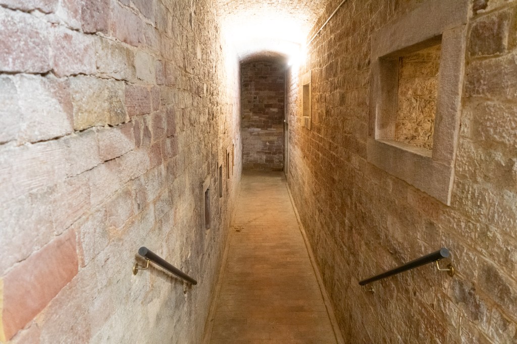 Es gibt steinerne Wendeltreppen, massive Sandsteinmauern, Gänge mit Schießscharten (zur Verteidigung im Festungsgraben) und große Kasemattenräume ohne Fenster.