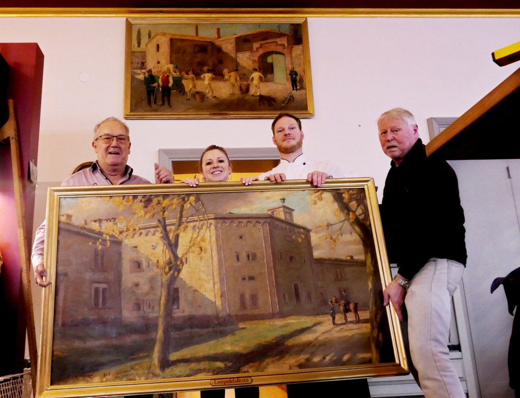 Auch das junge Gastronomie-Wirtspaar des „Schnitzelbräu“, Sabine und Michael Hauns, zeigte sich sehr aufgeschlossen. So postierten „Charly“ Fritz mit Dieter Wolf und Helfern in luftiger Höhe die beiden Gemälde im Gastraum. Damit wird das ansprechende Ambiente der historischen Gaststätte mit modernem Konzept weiter aufgewertet.