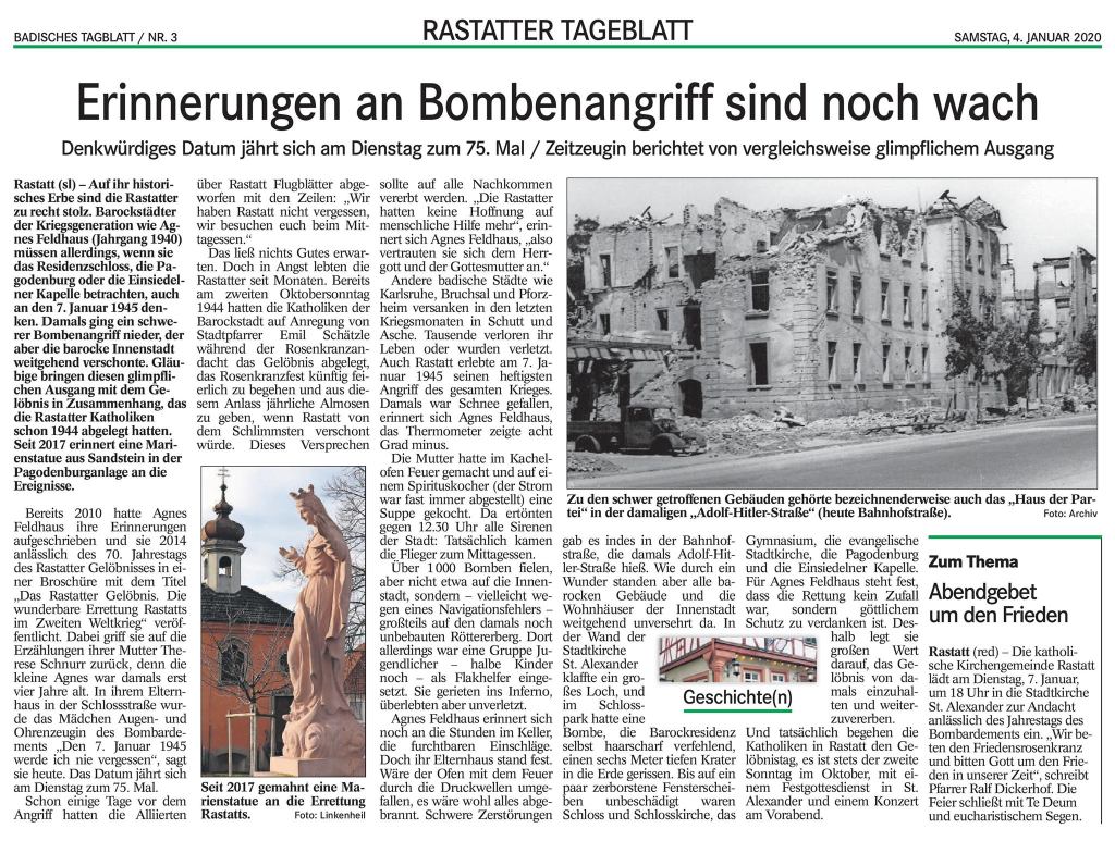 Vor 75 Jahren, am 7. Jan.1945“: Luftangriff auf unsere Stadt u. “Röttererberg“. Ca. 1000 Bomben sollten Rastatt vernichten. Zu beklagen waren 96 Tote u. 300 Verletzte.